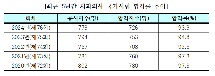 우선 치과의사는 필기시험에서 전체 778명의 응시자 중 726명이 합격해 93.3%의 합격률을 기록했다.