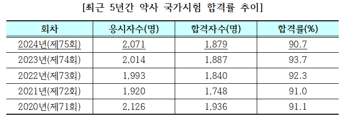 약사 국시 합격률은 ▲2020년 91.1% ▲2021년 91% ▲2022년 92.3% ▲2023년 93.7% 등으로 높아지다 이번 시험에서 합격률이 소폭 낮아졌다.