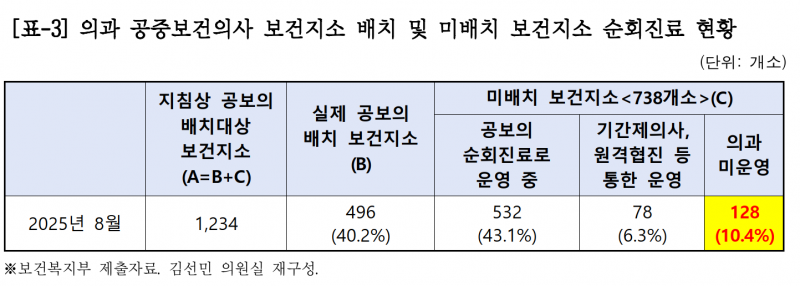 나머지 738개 보건지소 중 128곳은 순회진료나 원격협진조차 운영하지 못한 채 의사 공백 상태에 놓여 있다.