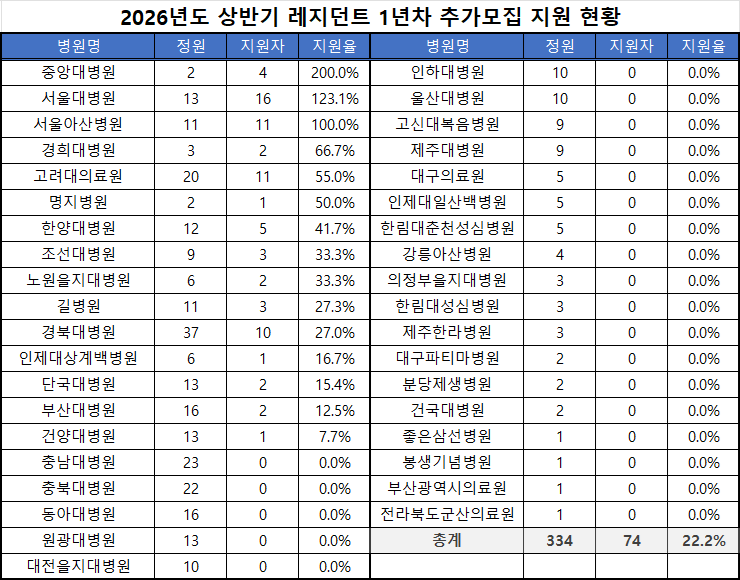 데일리메디가 2026년도 상반기 레지던트 1년차 추가모집을 진행한 100곳 수련병원 가운데 38곳의 응답을 받아 분석한 결과, 이들 모집 정원 334명 중 지원자는 74명(22.2%)으로 집계됐다. 병원 단위로는 38곳 중 23곳이 지원자 0명을 기록했다.