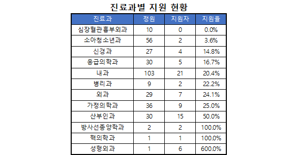 심장혈관흉부외과는 정원 10명에 지원자 0명이었고, 신경과는 27명 모집에 4명 지원(14.8%), 응급의학과는 30명 모집에 5명 지원(16.7%), 내과는 103명 모집에 21명 지원(20.4%)으로 모두 낮은 수준에 머물렀다.