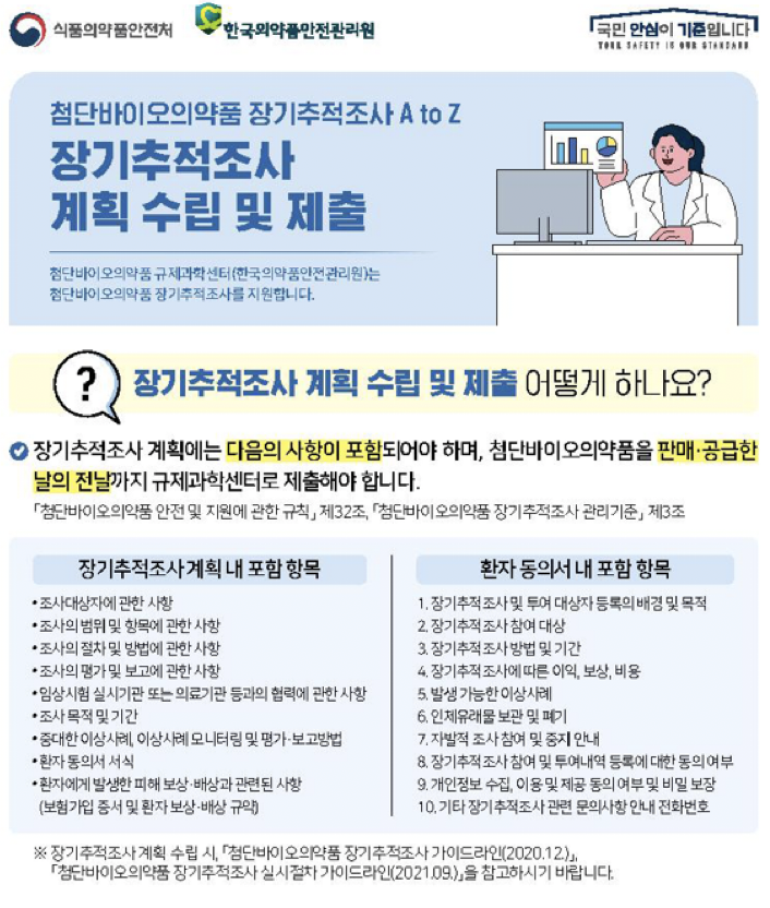 장기추적조사 제도의 전반적 이해 및 실제 현장에서 원활한 장기추적조사 이행을 돕기 위한 것으로 첨단바이오의약품 관련 업계 종사자 및 의료기관, 유관 학회 등에 제공한다.