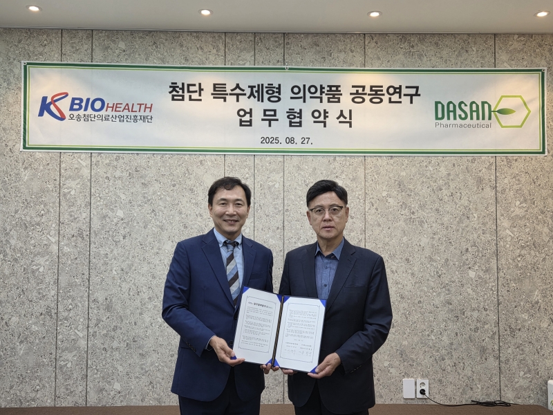 오송첨단의료산업진흥재단(KBIOHealth, 이사장 이명수)과 다산제약(대표 류형선)은 특수 제형 의약품의 공동 연구개발과 글로벌 상용화를 위한 전략적 업무협약(MOU)을 체결했다고 1일 밝혔다.