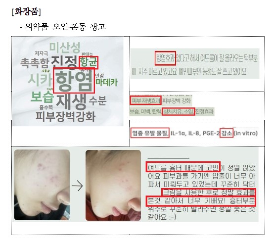 화장품의 경우 ▲‘염증 유발 억제’, ‘항염·항균작용’ 등 효과가 있는 것처럼 의약품 오인 광고 ▲자외선차단지수 관련 소비자가 잘못 인식할 우려가 있는 광고 ▲일반화장품을 ‘주름 개선’, ‘미백’ 등 오인하게 만드는 광고 등이 적발됐다.