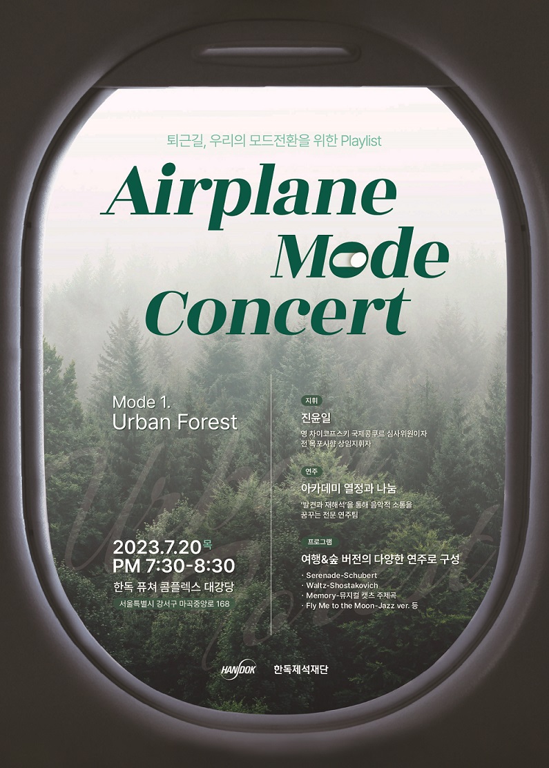한독(대표이사 김영진, 백진기)과 비영리공익법인 한독제석재단은 오는 7월 20일 서울 마곡에 위치한 한독 퓨쳐 콤플렉스에서 ‘에어플레인 모드 콘서트’를 개최한다.
