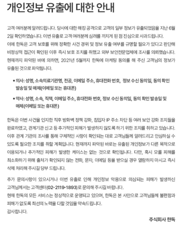 앞서 한독은 지난 6월 9일 '개인정보 유출에 대한 안내'를 공지했다.