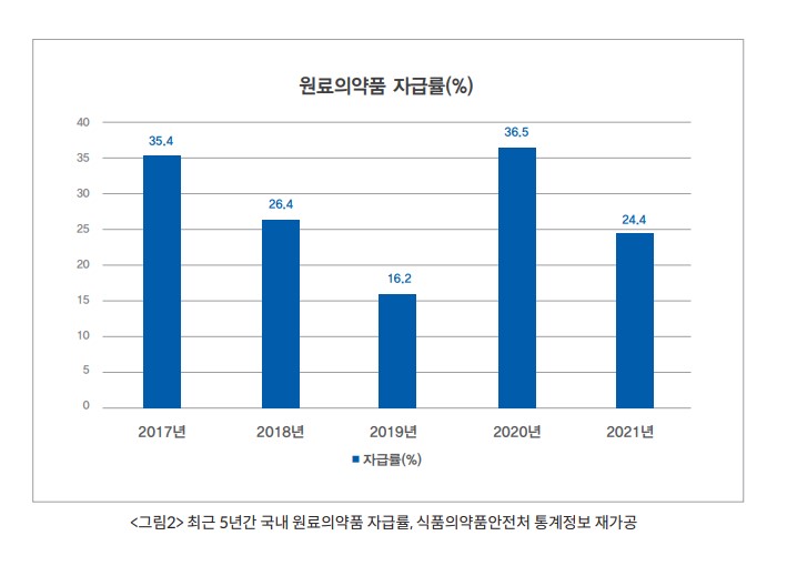 그러면서 “다만, 원료의약품 자급률은 해외 의존도가 매우 높고 개발 및 활성화에 있어 정부 지원이 미흡한 실정”이라며 “더구나 API 대량생산, 상업화 목표와 계획이 전무하다”고 덧붙였다.
