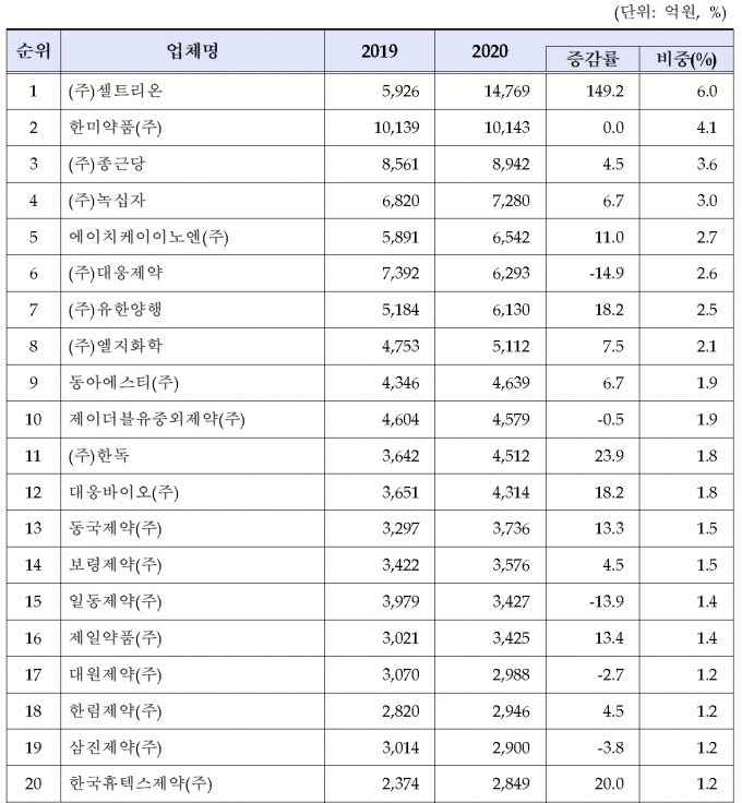 생산실적 상위 20개 제약사는 셀트리온, 한미약품, 종근당, 녹십자, HK이노엔, 대웅제약, 유한양행, LG화학, 동아ST, JW중외제약, 한독, 대웅바이오, 동국제약, 보령제약, 일동제약, 제일약품, 대원제약, 한림제약, 삼진제약, 한국휴텍스제약 순이다.