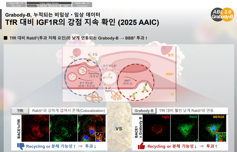 이 대표는 "TfR는 Rab5와 강하게 겹쳐서 존재한다. 반면 그랩바디-B(IGF1R 기반)는 훨씬 낮게 연동된다"고 밝혔다.