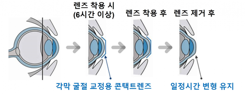 각막 굴절 교정용 콘택트렌즈는 야간 수면 시 착용하면 렌즈가 각막의 중심부를 눌러 모양을 변화시킴으로써 낮시간동안 일시적 근시교정 효과가 있는 하드콘텍트렌즈를 말한다.