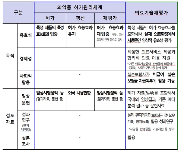 식약처는 "의료기술재평가 결과는 본래 '급여 전환 및 비급여 유지, 비급여 삭제' 등 보건복지부의 급여 정책 판단으로 이어지는 절차이며, 식약처 임상 재평가 제도와는 목적이 다르다"고 밝혔다.