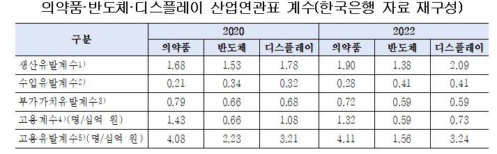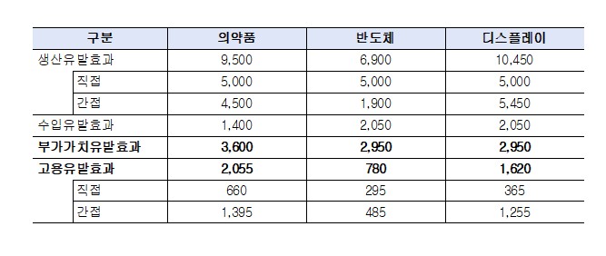 그 결과, 생산 유발 효과는 디스플레이 > 의약품 > 반도체 순이었지만 부가가치와 고용유발 효과에서는 의약품이 가장 높았다.