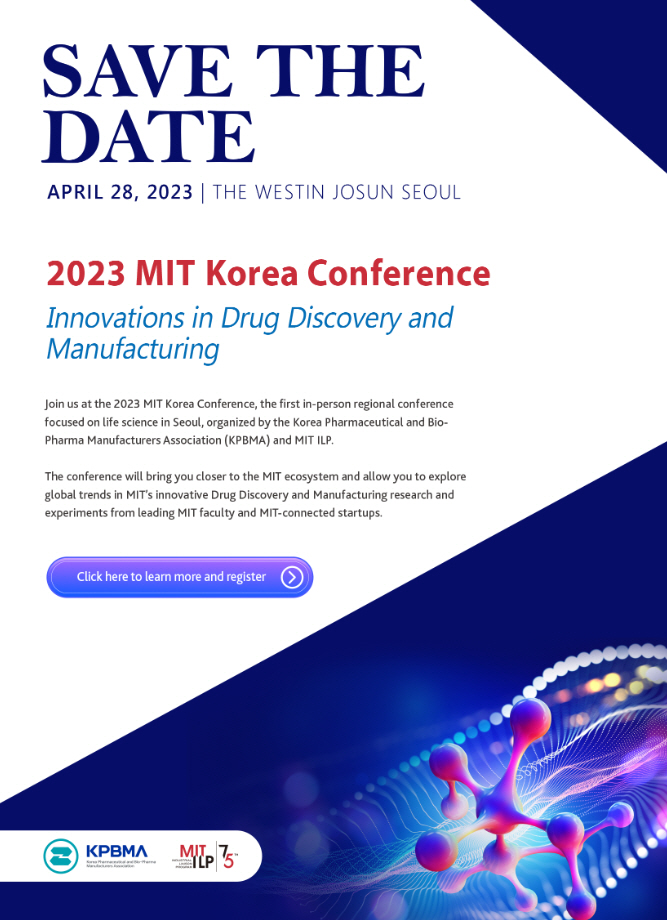 한국제약바이오협회(회장 노연홍)는 미국 매사추세츠 공과대학교 산학협력프로그램(이하 MIT ILP)과 오는 4월 28일 웨스틴조선에서 ‘2023 MIT-코리아 컨퍼런스’를 개최한다고 11일 밝혔다.