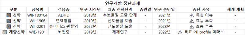 여기에 ‘WII-2201(류마티스 관절염 치료제)’는 2022년 연구가 시작됐지만 불과 1년 만인 2023년 ‘효능 부족’으로 과제가 종결됐다.