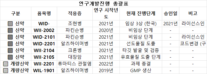 구체적으로 ‘WII-2002’, ‘WID-2101’은 파킨슨병을 적응증으로 각각 지난 2020년, 2021년 임상이 시작된 이후 4~5년 지났지만 현재까지도 비임상 단계에 머무르고 있는 상황이다.