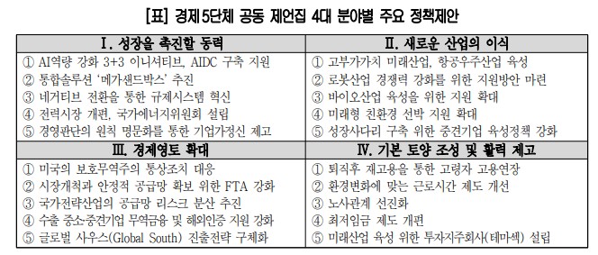 경제5 단체가 정책 제언집을 공동 발표한 것은 이번이 처음이다. 대선후보에게 대내외 위기상황을 극복할 대책을 한 목소리로 주문해야 한다는 공감대가 있었던 것으로 보인다