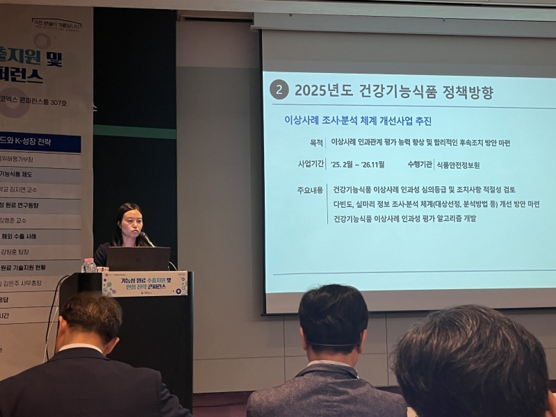 최은주 식품의약품안전처 건강기능식품정책과 사무관은 26일 서울 코엑스에서 열린 '건기식 기능성 원료 인정 및 심사 민원 설명회'에서 이 같은 내용의 '2025년 건기식 정책동향'을 발표했다.