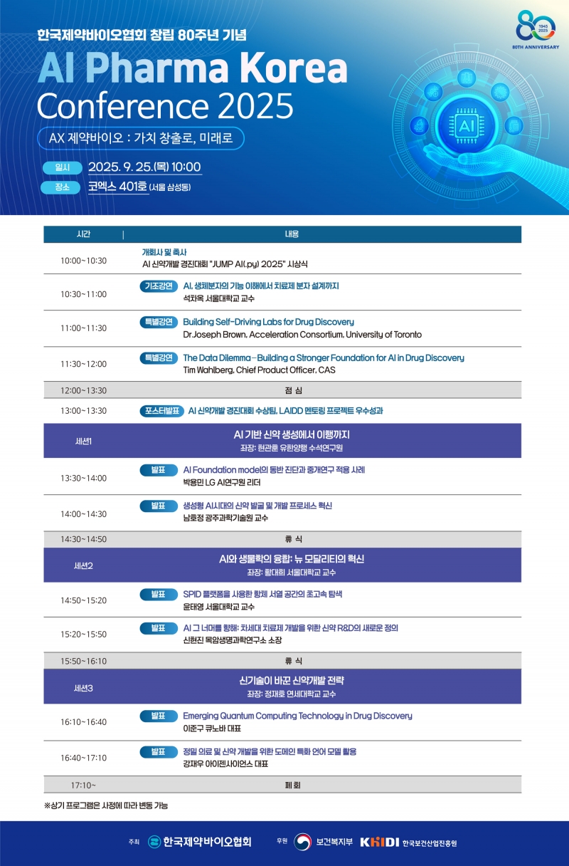 이번 컨퍼런스는 ‘AX 제약바이오 : 가치 창출로, 미래로’를 주제로 열린다. 행사는 협회 창립 80주년 기념사업의 하나로 국내 제약바이오산업의 디지털 전환을 상징하는 대표 행사로 마련됐다.