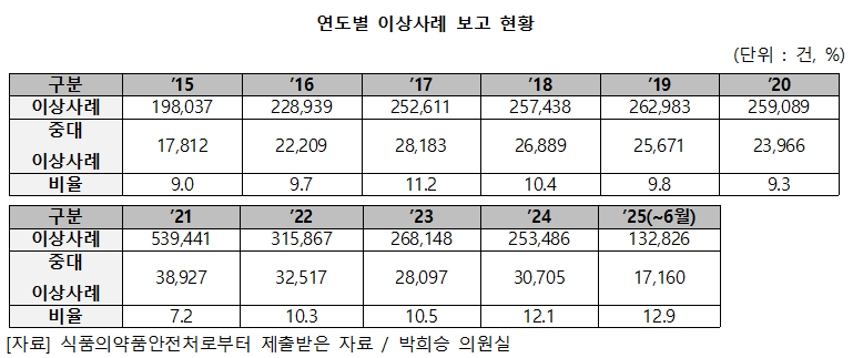 이 가운데 중대 이상사례가 29만2136건으로 전체 이상사례 9.8%에 달했다. 특히 이 비율은 올해 12.9%로 최근 11년 중 최대치였다.