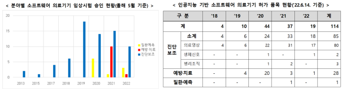 20일 식품의약품안전처(처장 오유경)가 공개한 소프트웨어 의료기기 분야별 임상시험 및 허가 사례·현황 정보에 따르면, 2018년 5월 첫 허가 이후 지난 14일 기준 총 114품목이 소프트웨어 의료기기로 허가를 받았다.