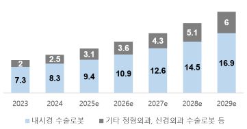 글로벌 시장조사기관 ‘프리시던스 리서치’(Precedence Research)에 따르면 2024년 세계 수술로봇 시장은 108억 달러(약 15조)로 평가됐으며, 연평균 16% 성장해 2029년에는 229억 달러(약 33조 원)로 확대될 전망이다.