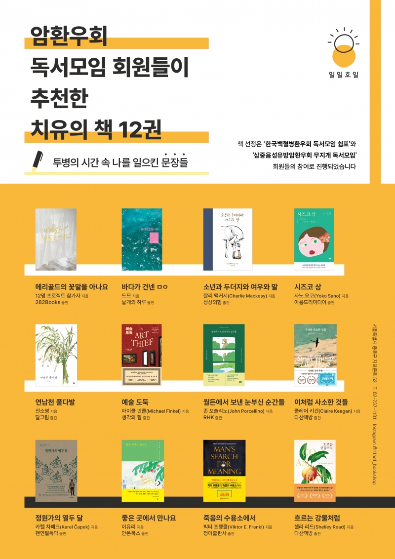 22일 일일호일에 따르면 추천 도서는 한국백혈병한우회 독서모임 ‘쉼표’와 삼중음성유방암환우회 우리두리구슬하나의 ‘무지개 독서모임’에서 환우들이 함께 읽은 책을 대상으로 투표를 진행, 각각 6권씩 총 12권을 선정했다.