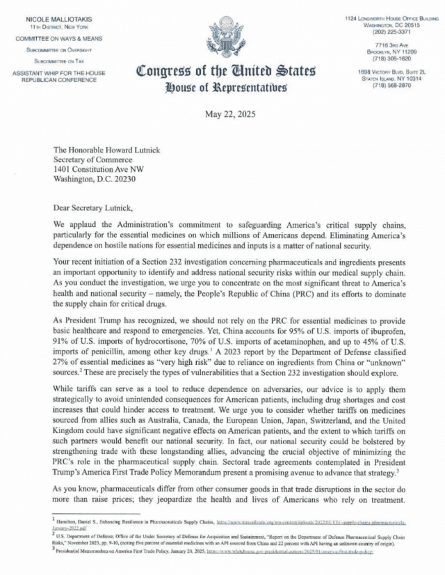 이들은 "우리는 미국의 핵심 공급망, 특히 수백만 미국인이 의존하는 필수의약품을 보호하려는 행정부 의지를 높이 평가한다. 필수의약품과 물자에 대한 적대국 의존도를 없애는 것은 국가 안보의 문제"라고 지적했다.