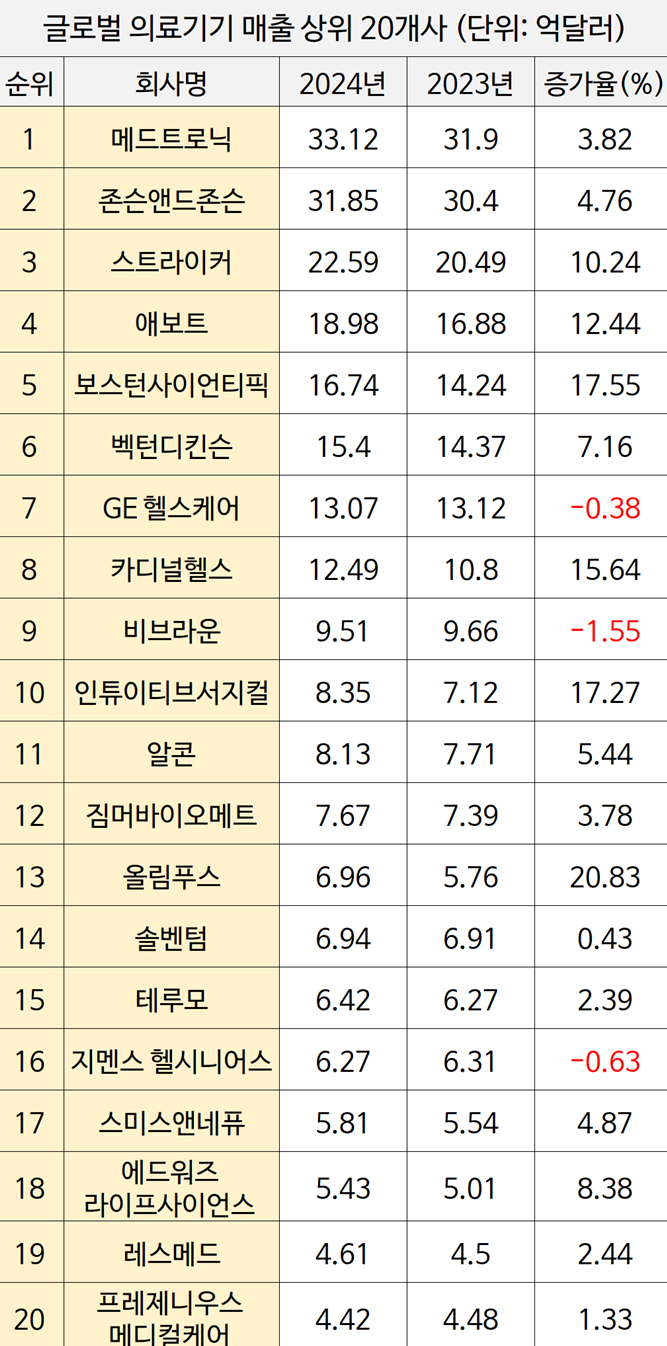 뒤를 이어 존슨앤드존슨(Johnson & Johnson)이 318억5000만 달러, 스트라이커(Stryker)가 225억9000만 달러 매출을 올리며 각각 2위와 3위를 차지했다.