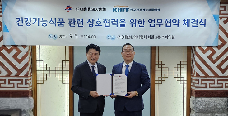 대한한의사협회(회장 윤성찬)는 최근 한국건강기능식품협회(회장 정명수)와 건강기능식품 산업의 활성화와 육성 발전 업무협약을 체결했다고 6일 밝혔다.