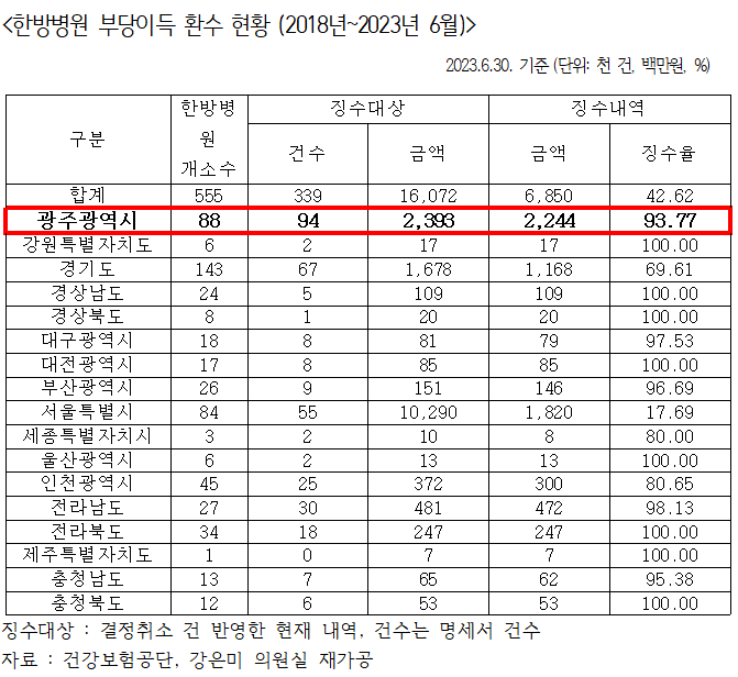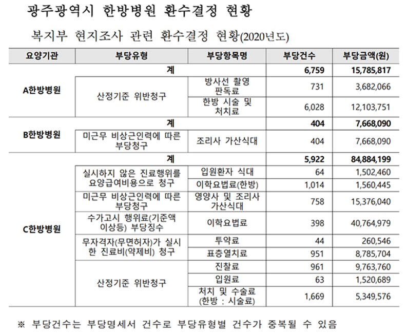 하지만 건강보험공단 자료에 의하면 2018년부터 2023년 6월 30일 기준 부당이득 환수 건수는 광주 소재 한방병원이 전국에서 가장 많은 94건을 기록했다.