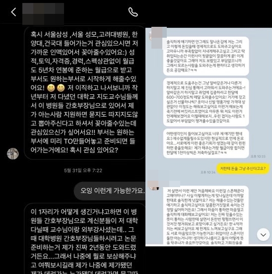 최초 메시지의 경우 빅5 병원 취업알선을 목적으로 접근하고 이후 개인 메신저 카카오톡으로 넘어가 '스폰' 관련 제안을 하는 형태다.