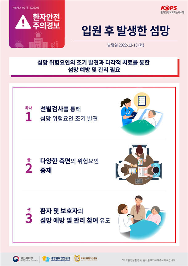 환자안전사고의 예방 및 재발방지를 위해 발령된 환자안전 주의경보는 섬망으로 낙상, 자살·자해, 상해 등 환자에게 위해(危害)가 발생한 주요 사례와 재발방지를 위한 권고사항 및 관련 예방 활동 사례를 주요 내용으로 한다.