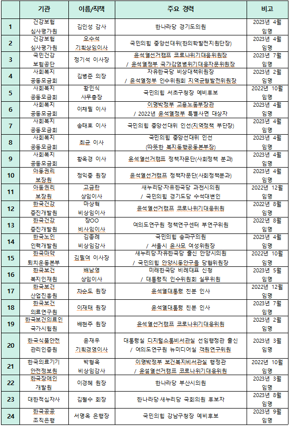 제출된 자료에 따르면 윤석열정부 출범 이후 금년 7월까지 14개 기관에서 기관장 및 임원으로 새로 임명된 사람은 모두 45명이고 이 가운데 22명이 윤석열정부 및 국민의힘과 관련된 인사라는 것. 금년 8~9월에도 2명의 기관장이 추가 임명됐는데, 대선 당시 윤석열 후보 선거캠프 또는 대선 이후 인수위원회와 관련된 경력이 있거나 국민의힘과 연관된 정치인이 포함.