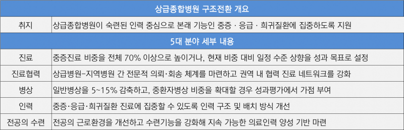 구조전환 목표는 입원 환자 중 중증질환자 비중을 70%까지 높이는 것이며, 병상 수 외에도 중환자실 병상 비율, 중증 수술 건수 등이 성과지표에 포함되고 있다.