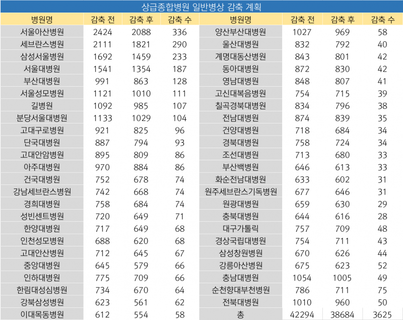 이어 세브란스병원은 290병상(2111→1821), 삼성서울병원은 233병상(1692→1459), 서울대병원은 187병상(1541→1354), 서울성모병원은 111병상(1121→1010)을 각각 줄인다.