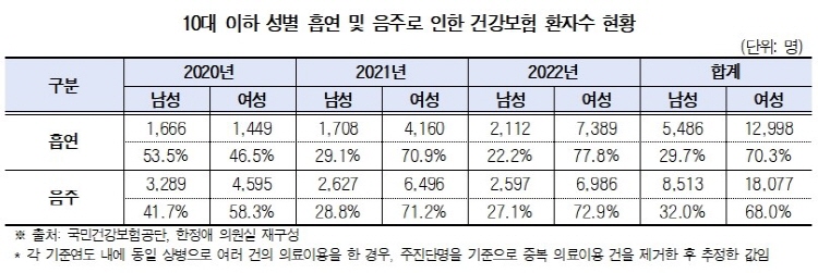 이에 따라 흡연과 음주로 인한 환자의 성비가 10대 이하에서는 여성이 남성보다 압도적으로 많았다. 지난 2020~2022년 흡연 관련 질병 환자수는 여성이 70.3%, 음주 관련 질병 환자수는 여성이 68%를 차지했다.