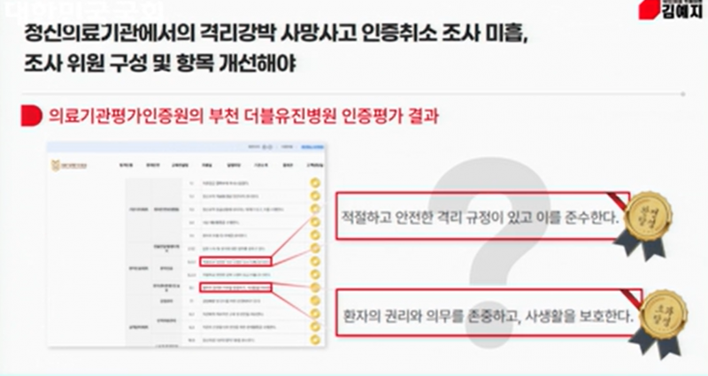 국회 보건복지위원회 김예지 의원(국민의힘)은 22일 “해당 병원은 복지부 인증을 받은 기관인데 환자 사망 이후에도 인증이 그대로 유지되고 있다”고 지적했다.