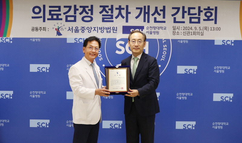 순천향대서울병원이 9월 5일 병원 내 회의실에서 서울중앙지방법원과 의료감정 업무에 대한 간담회를 가졌다. 이날 간담회에는 이정재 순천향대서울병원장과 김정중 서울중앙지법원장 등 관계자들이 참석해 신체감정 업무에 대한 법원과 병원 상호 간 현장 상황을 공유하고 의료감정 절차의 효율적인 개선 방안 등을 논의했다.