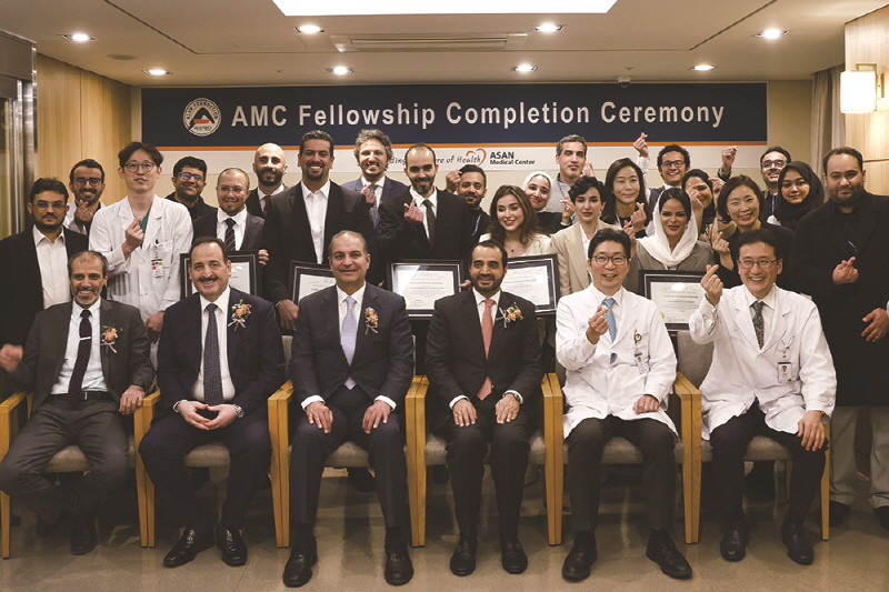 서울아산병원에서 연수를 받은 중동 의학자들 수료식이 최근 동관 스카이라운지에서 열렸다. 이번 행사에는 서울아산병원 김건석 교육부원장을 비롯해 전인호 국제사업실장과 주한 사우디아라비아 대사 및 쿠웨이트 대사, 오만 대사, 동료 해외의학자 등 40여 명이 참석해 축하하고 격려했다.