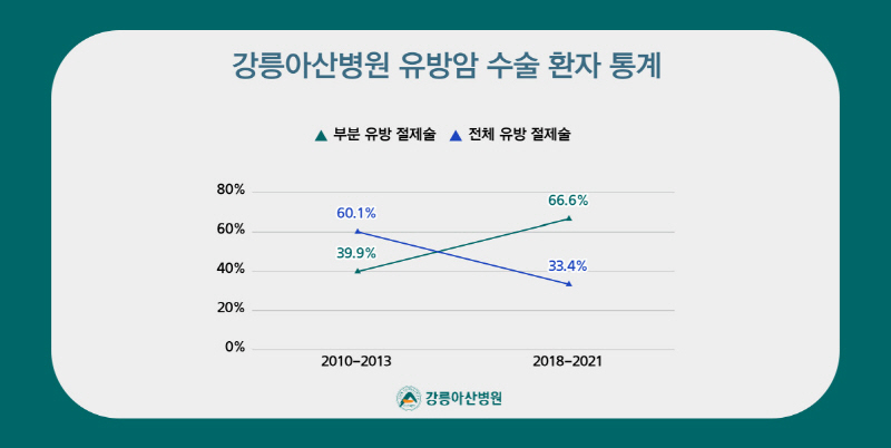강릉아산병원이 시행한 유방암 수술법 비중은 지난 10년간 부분 유방 절제술이 늘고 전체 유방 절제술은 줄어든 것으로 나타났다.