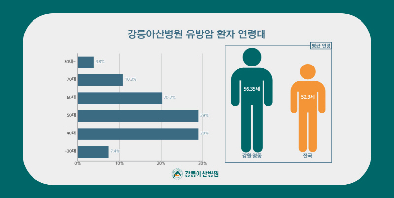 강릉아산병원에서 수술한 유방암 환자의 연령대 분포는 ▲0세~39세 7.4% ▲40세~49세 29.0% ▲50세~59세 29.0% ▲60세~69세 20.2% ▲70세~79세 10.8% ▲80세 3.8%로, 주로 40대~60대의 발병률이 높게 나타났다.