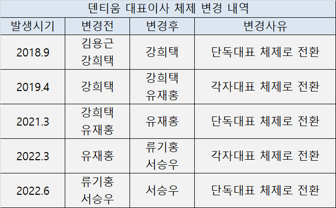 덴티움이 지난 1일 서승우·류기홍 각자대표 체제에서 서승우 단독대표 체제로 변경했다고 밝혔다.