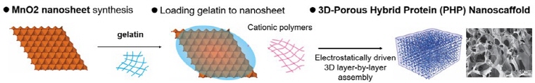 연구팀은 2D 이산화망간 나노시트를 제작해 젤라틴과 결합했다. 이어 3D 하이브리드 기술을 이용해 생체 내 주입이 가능하고, 생분해성을 가진 3D 단백질 나노스캐폴드를 제작했다.
