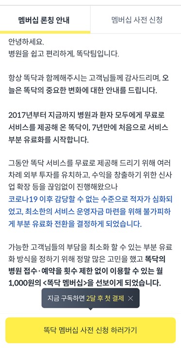 이에 따라 유료 멤버십 가입 회원만이 똑닥 병의원 예약 서비스를 이용할 수 있다. 이용 요금은 월 1000원, 연간 1만원으로 횟수에는 제한을 두지 않는다.