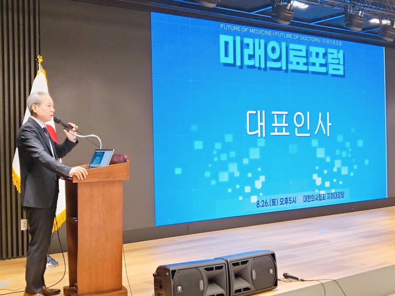 주수호 미래의료포럼 대표가 26일 서울 용산구 의협에서 열린 창립총회에서 인사말을 전하고 있다. 서동준 기자