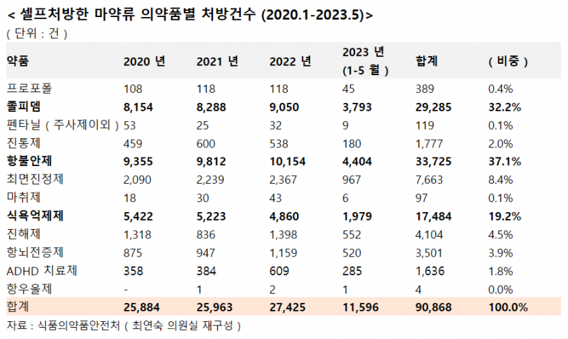 최연숙 의원실이 식약처로부터 제출받은 따르면 최근 3년 간 매년 전체 의사 중 11%인 8000여 명(치과의사 포함)이 마약류 의약품을 셀프처방했다.