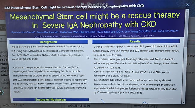 "치료 불가능한 중증IgA 신장염 환자에게 고용량 스테로이드요법과 자가 지방유래 줄기세포(stromal vascular fraction)을 이용해서 10년이상 추적 관찰한 결과 대부분 증상이 호전, 신장기능이 잘 유지됐다"고 밝혔다.