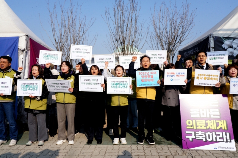 신승일 전국의료산업노동조합연맹 위원장은 "의대 정원은 특정 집단의 전유물이 아니다"며 "정부는 정원 동결 방침을 철회하고 엄정히 학칙을 적용하라"고 목소리를 높였다.