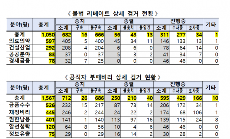 각 분야 상세 단속 인원 현황을 살펴보면 불법 리베이트는 △의료·의약 분야 597명(구속 5명) △건설산업 분야 292명(구속 4명) △관급거래 등 공공분야 83명 △경제·금융 분야 78명(구속 7명) 등이다.