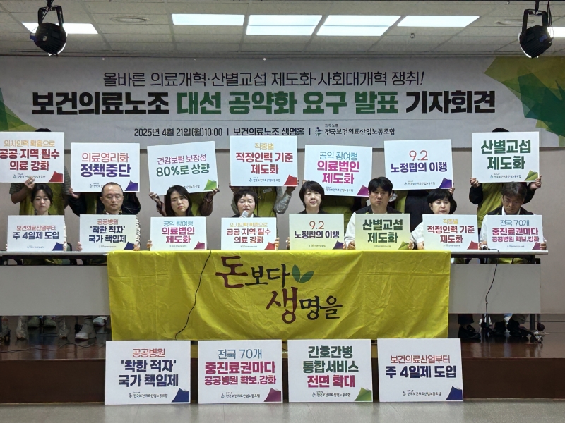 21일 보건의료노조는 서울 영등포구 소재 생명홀에서 '대선 공약화 요구 발표 기자회견'을 열고 이 같이 제시했다.